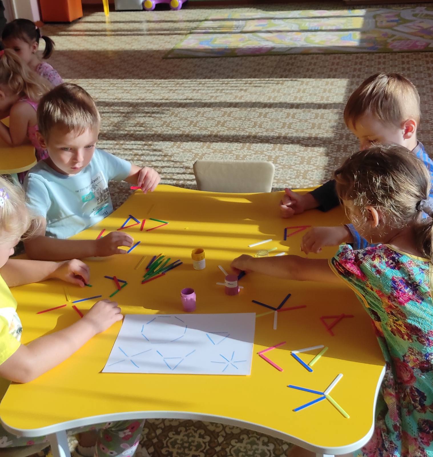 Воспитанники средней группы на занятии по формированию математических представлений строили звёзды из счётных палочек. Дидактические игры со счётными палочками помогают в изучении цветов и геометрических фигур, конструировании и решении логических задач. Они помогают быстрее освоить такие понятия, как «короткий — длинный», «высокий — низкий», «большой — маленький». Помимо мелкой моторики счётные палочки развивают такие важные качества, как самостоятельность, усидчивость, воображение, сосредоточенность и способность к планированию.