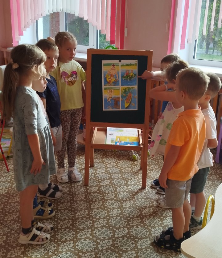Основное внимание было уделено детской безопасности во время купания, закреплены алгоритмы действий в период обострение ситуации, а также о правилах помощи тонущего человека. С воспитанниками были созданных творческие работы по безопасности на воде, а также прочитаны стихи о необходимости знания правил поведения у воды.