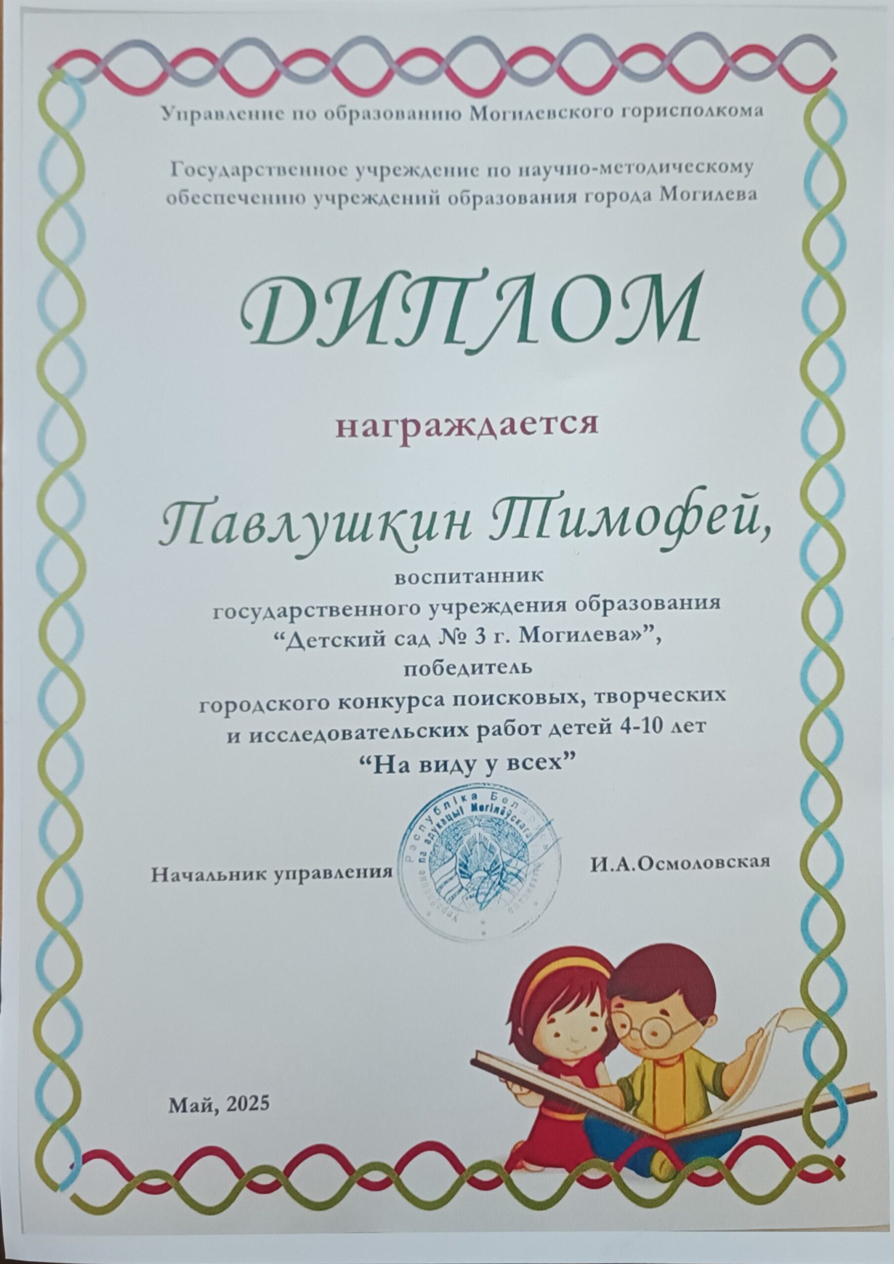 Воспитанник старшей группы Павлушкин Тимофей награжден дипломам победителя городского конкурса поисковых, творческих  и исследовательских работ детей 4-10 лет «На виду у всех» в мае 2025 г.
