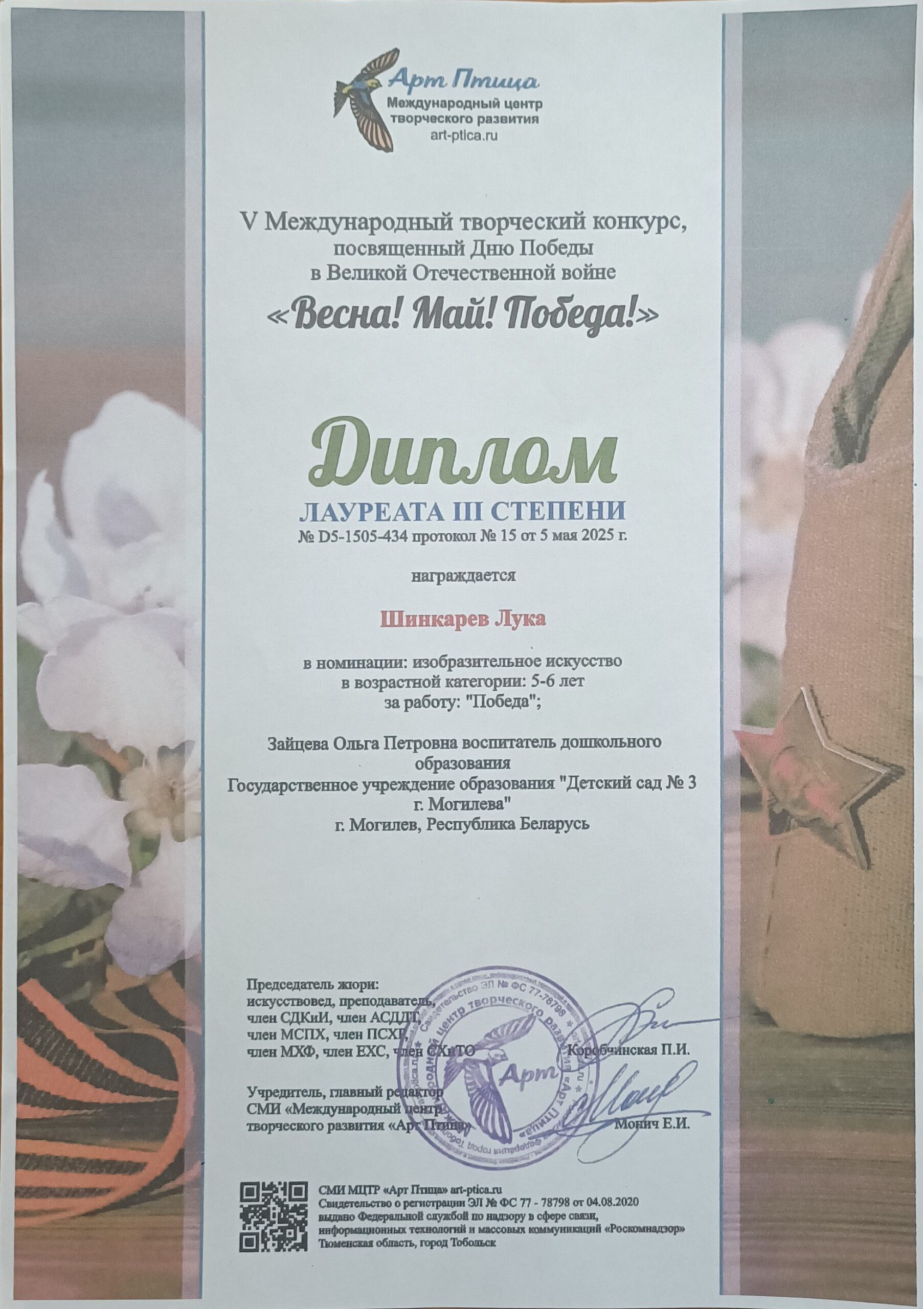 Воспитанник средней группы Шинкарев Лука награжден дипломам лауреата  III степени, V Международного творческого конкурса, посвященного Дню Победы в Великой Отечественной Войне «Весна! Май! Победа!» май 2025 г.