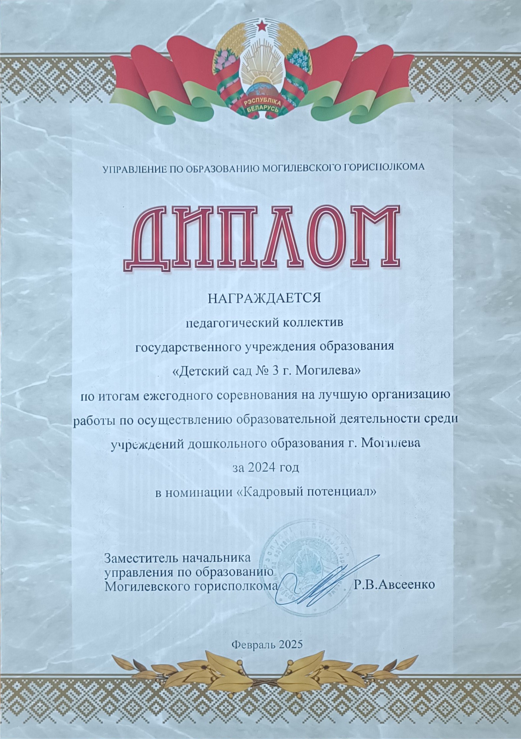 Педагогический коллектив учреждения награжден дипломам по итогам ежегодного соревнования на лучшую организацию работы по осуществлению образовательной деятельности среди учреждений дошкольного образования г. Могилева за 2024 год в номинации «Кадровый потенциал»