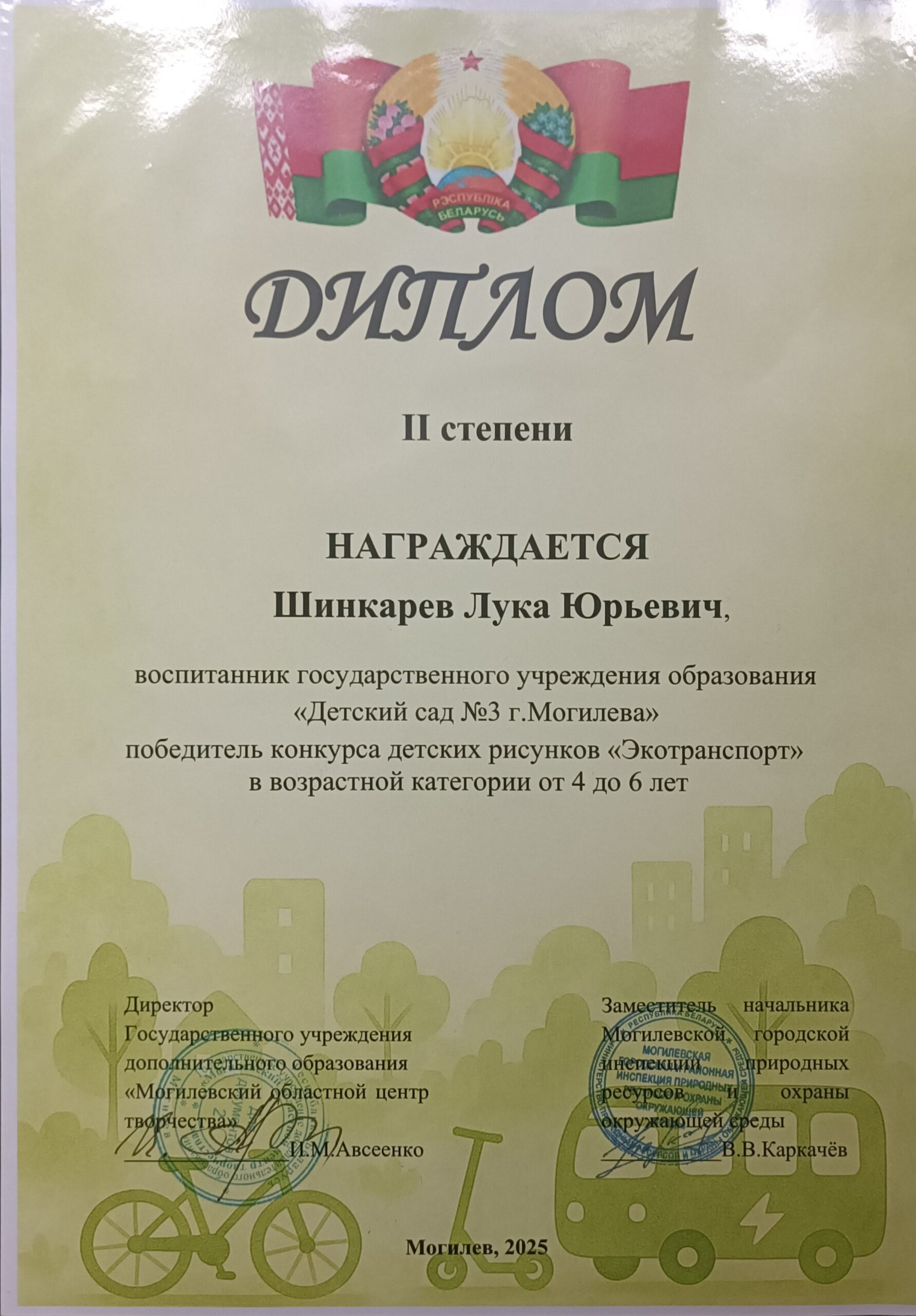 Воспитанник старшей группы   Шинкарев Луку  награжден Дипломом II степени.  в конкурсе детских рисунков «Экотранспорт» проводимым  Могилевской городской и районной инспекцией природных ресурсов и охраны окружающей среды совместно с Государственным учреждением дополнительного образования «Могилевский областной центр творчества»  Сентябрь 2025 г.