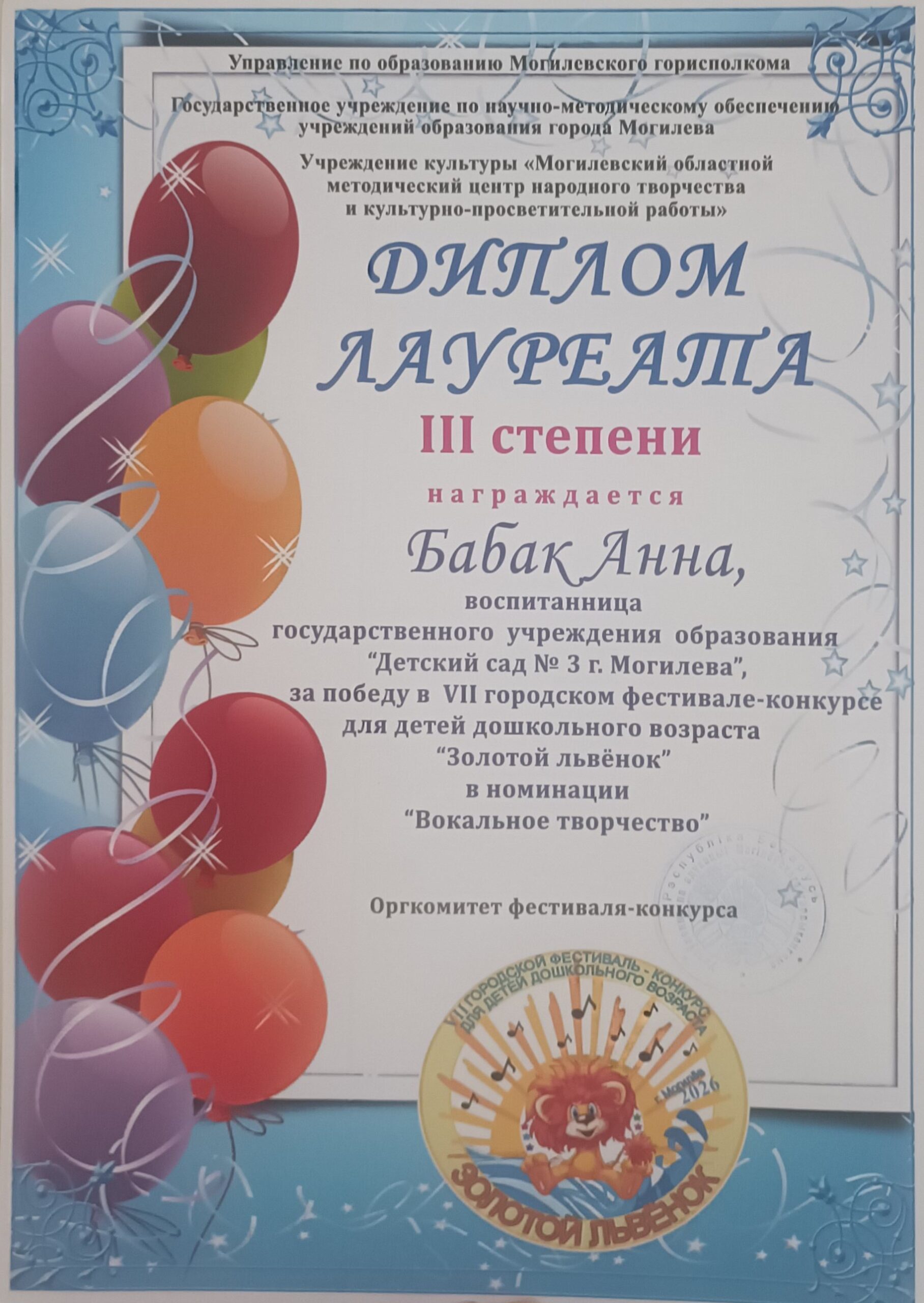Воспитанница средней группы Анна Бабак награждена дипломом  лауреата III степени на VII городском фестивале-конкурсе для детей дошкольного возраста «Золотой львенок», в номинации «Вокальное творчество». Апрель 2026г.